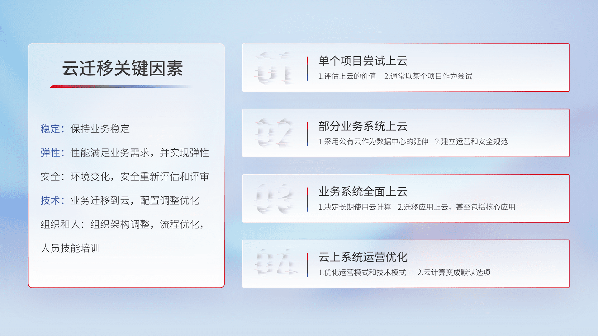 结合实际业务,,从规划设计、、、云平台选型、、、、云原生改造、、数据迁移、、、集成交付,,,迁移全过程为客户识别最佳上云路径,,,,做好风险识别管理,,,设计网络架构、、、、身份权限、、安全审计合规、、、操作审计、、、日志审计、、、、监控告警策略、、、、多站点容灾设计等,,,,对云上基础设施进行整体规划,,,,提升IT治理水平,,,,以满足弹性、、、、高可用、、、高性能的需求。。。